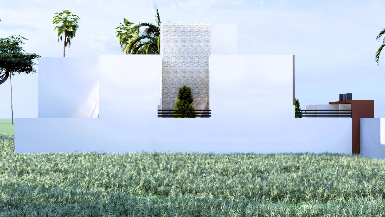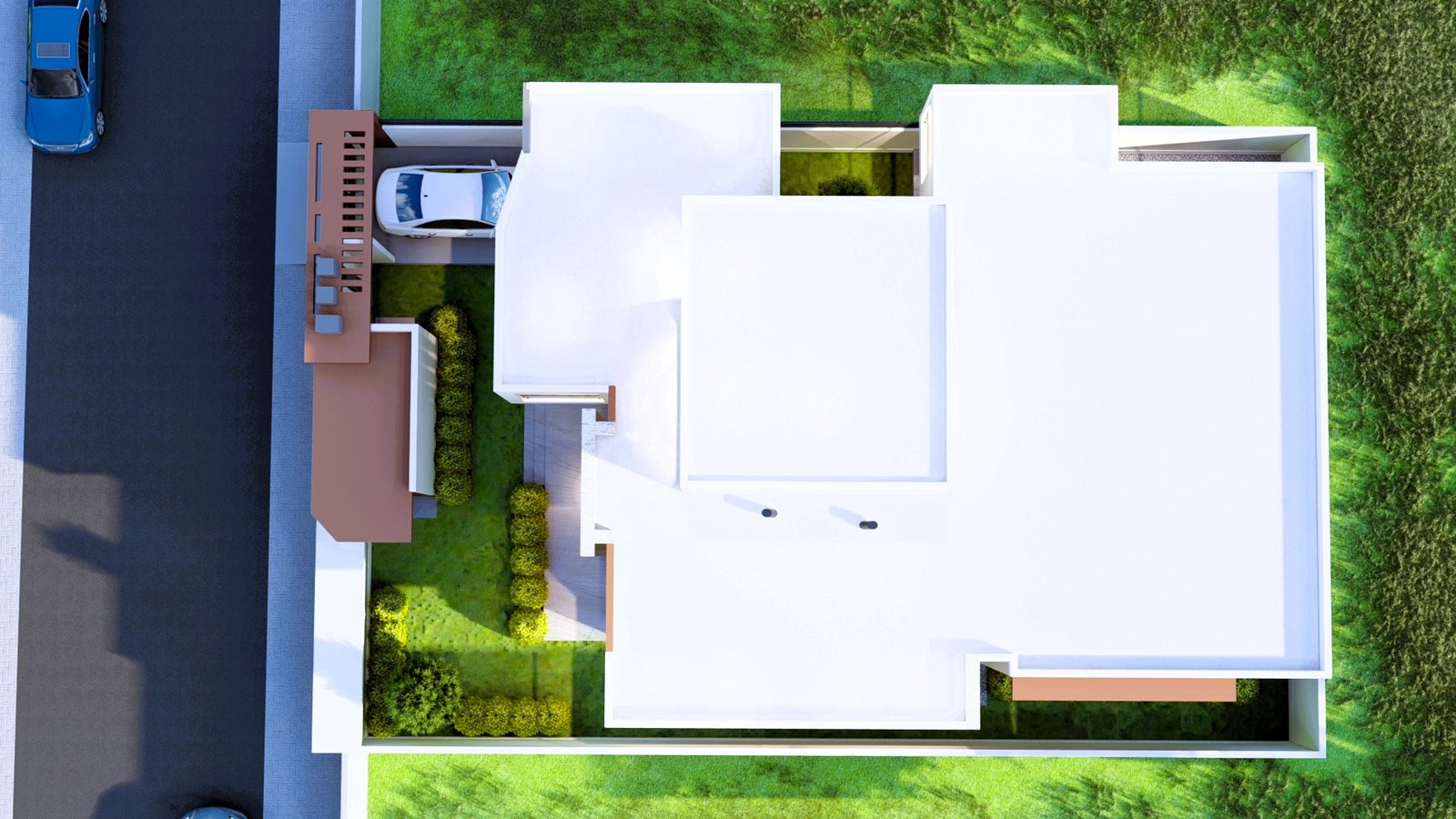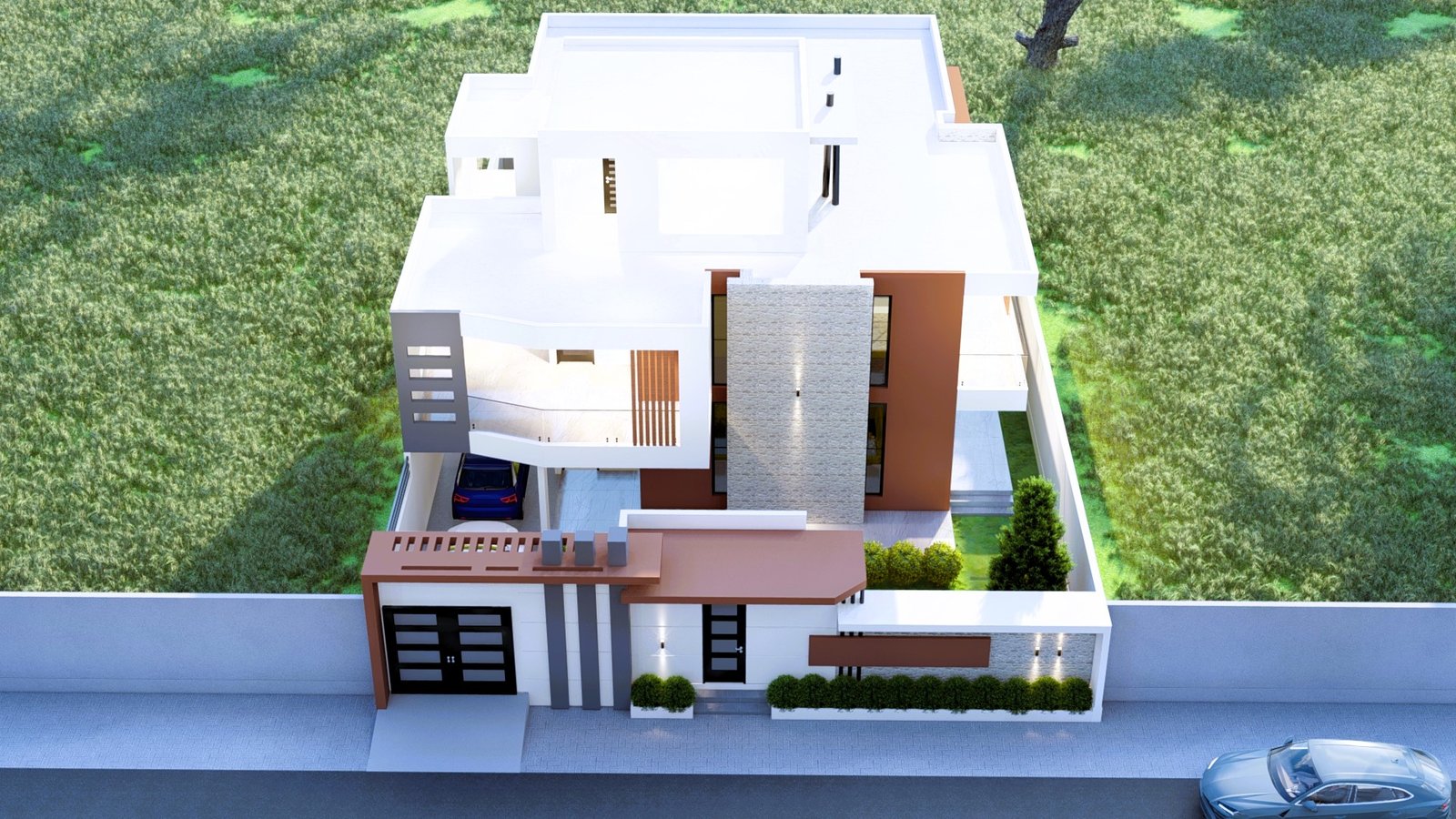 Maison moderne à deux niveaux au design contemporain, avec façade élégante mêlant blanc, gris et brun. De larges ouvertures vitrées, des terrasses lumineuses, un jardin soigné et un parking couvert offrent un cadre de vie confortable, moderne et haut de gamme, au cœur d’un environnement calme et verdoyant.