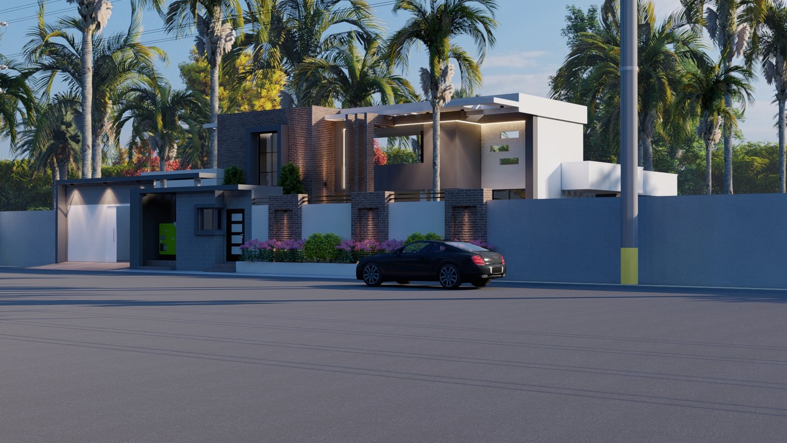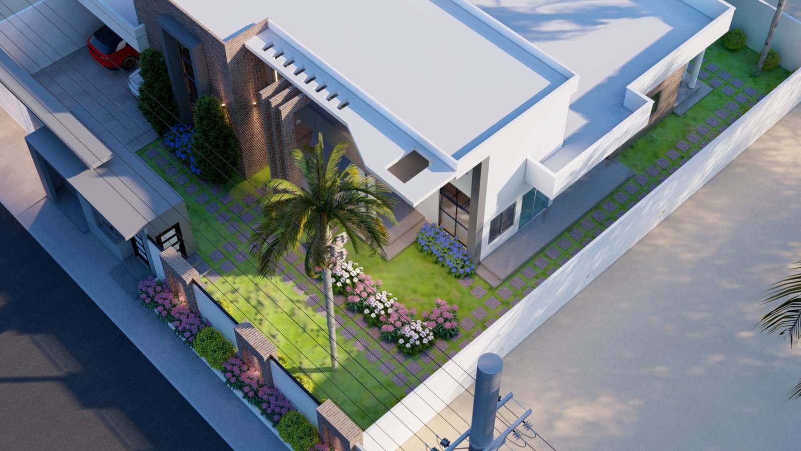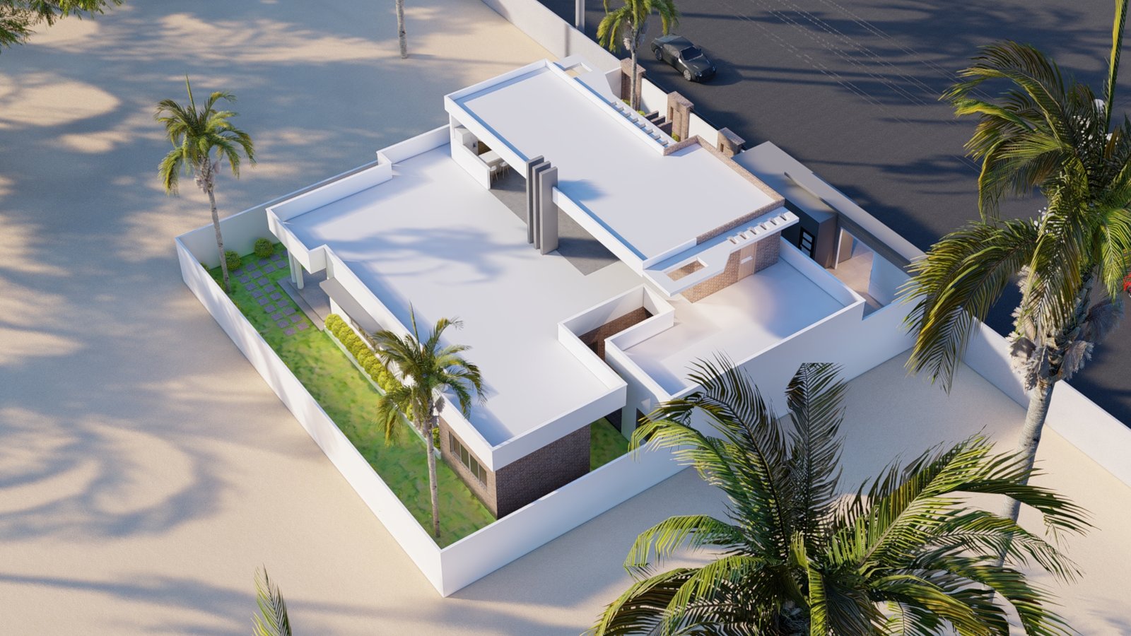 Maison moderne aux lignes nettes, toit plat et façade mêlant murs blancs, briques apparentes et éléments gris foncé. Son jardin soigneusement aménagé avec pelouse, palmiers et massifs fleuris offre une atmosphère élégante et tropicale. Entourée d’un mur blanc avec portail moderne, elle allie confort, lumière naturelle et design contemporain.