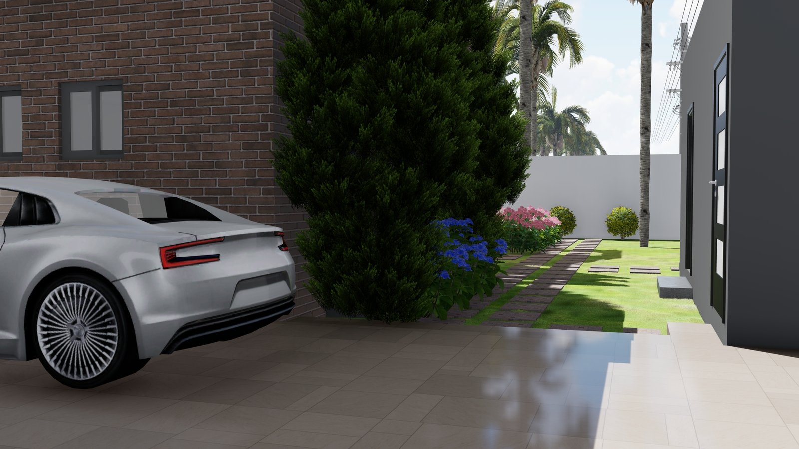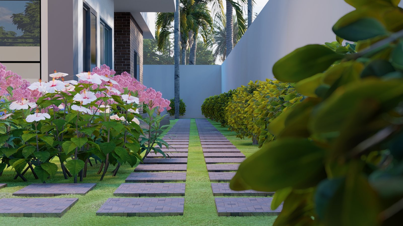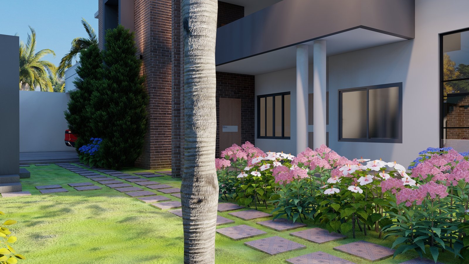 Maison moderne aux lignes nettes, toit plat et façade mêlant murs blancs, briques apparentes et éléments gris foncé. Son jardin soigneusement aménagé avec pelouse, palmiers et massifs fleuris offre une atmosphère élégante et tropicale. Entourée d’un mur blanc avec portail moderne, elle allie confort, lumière naturelle et design contemporain.