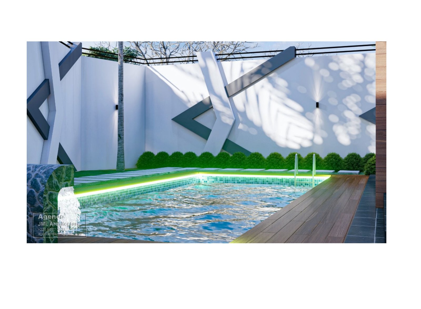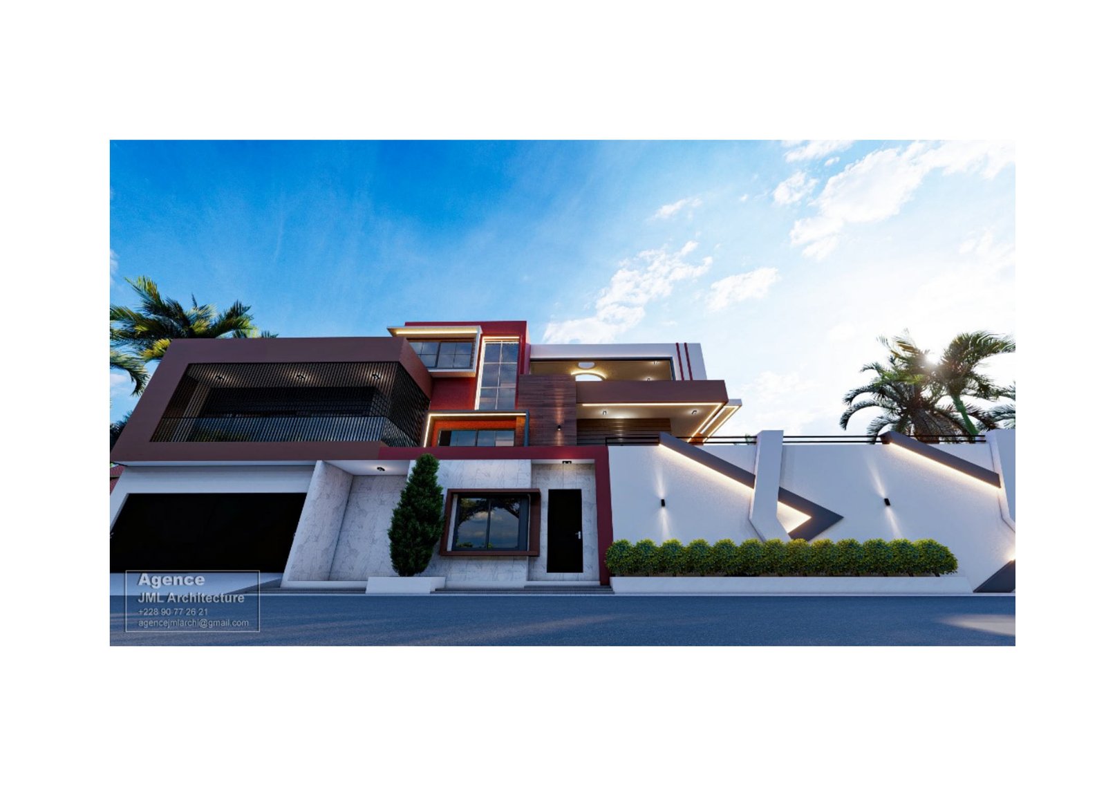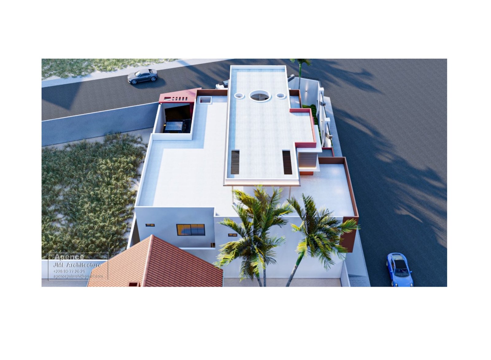 Vue aérienne d’une maison moderne à deux niveaux, mêlant formes cubiques, matériaux contrastés (blanc, bois, brique) et larges baies vitrées. Dotée d’une terrasse ouverte, d’une piscine et d’un jardin tropical, elle offre un cadre élégant et lumineux, signé Agence JML Architecture.