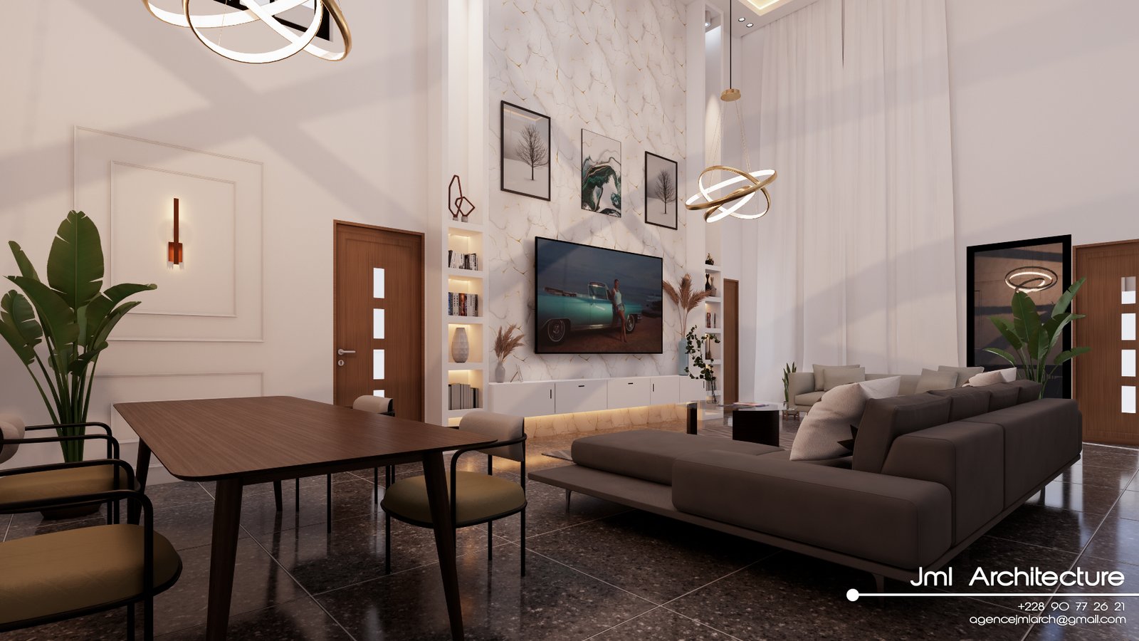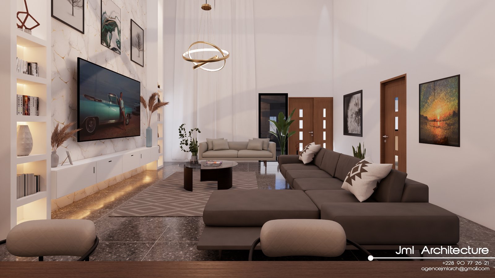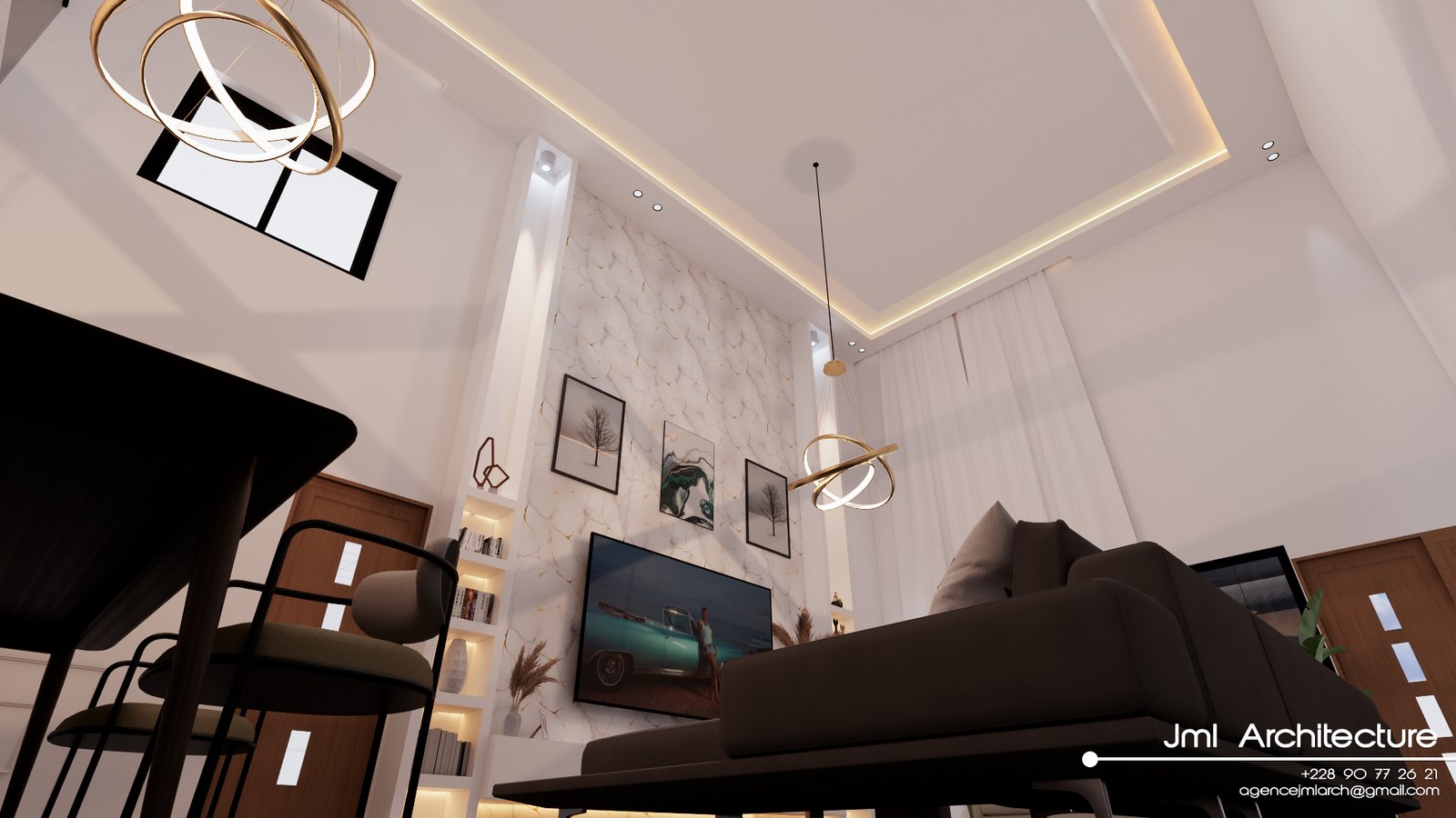 Espace vaste et lumineux avec plafond très haut, murs blancs et mur d’accent marbré au veinage doré. Mobilier design alliant canapé sombre, fauteuil beige et table basse en verre et bois, sublimé par un luminaire sculptural et des étagères rétroéclairées. Un intérieur sophistiqué, alliant luxe, modernité et confort chaleureux.