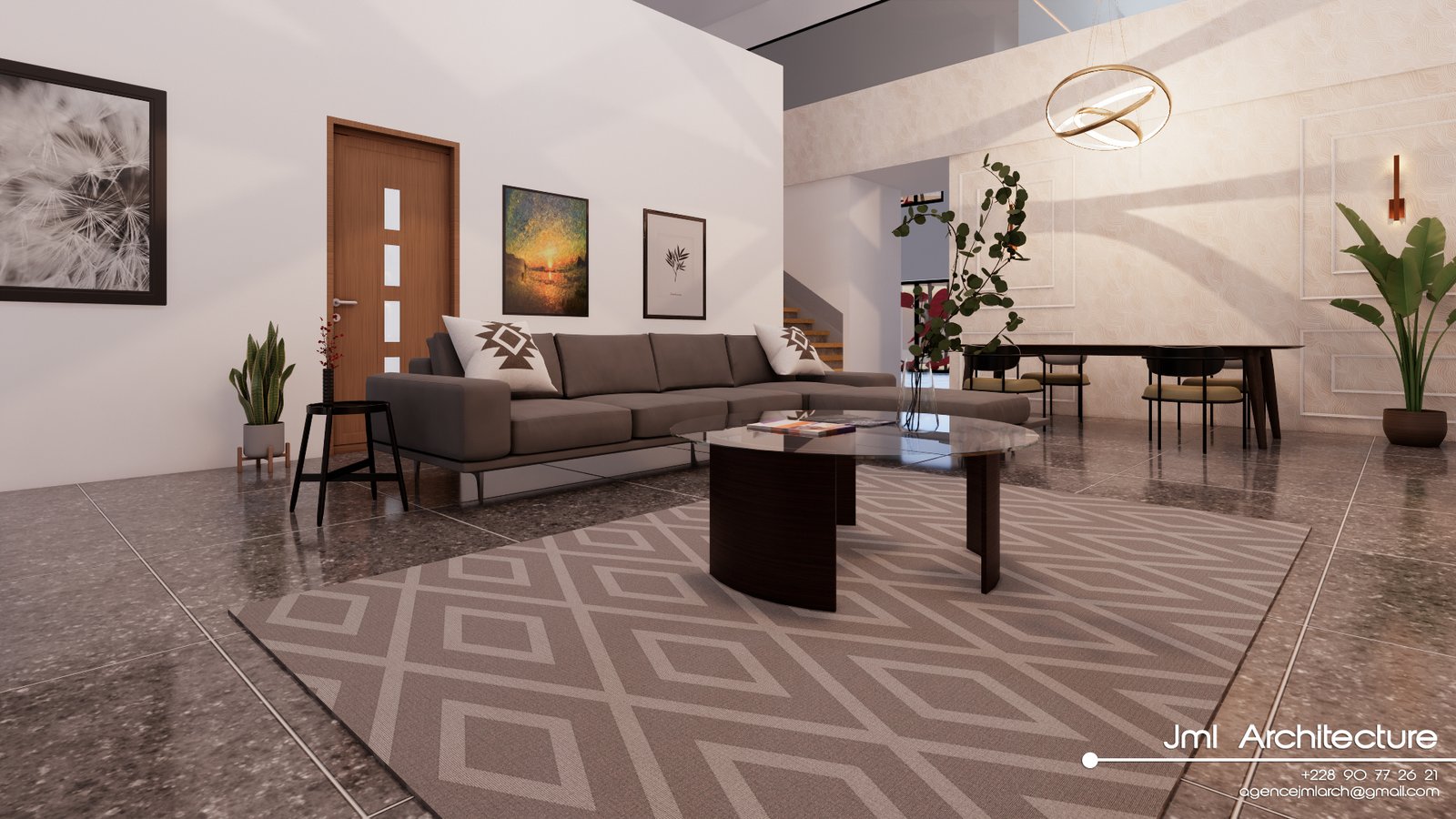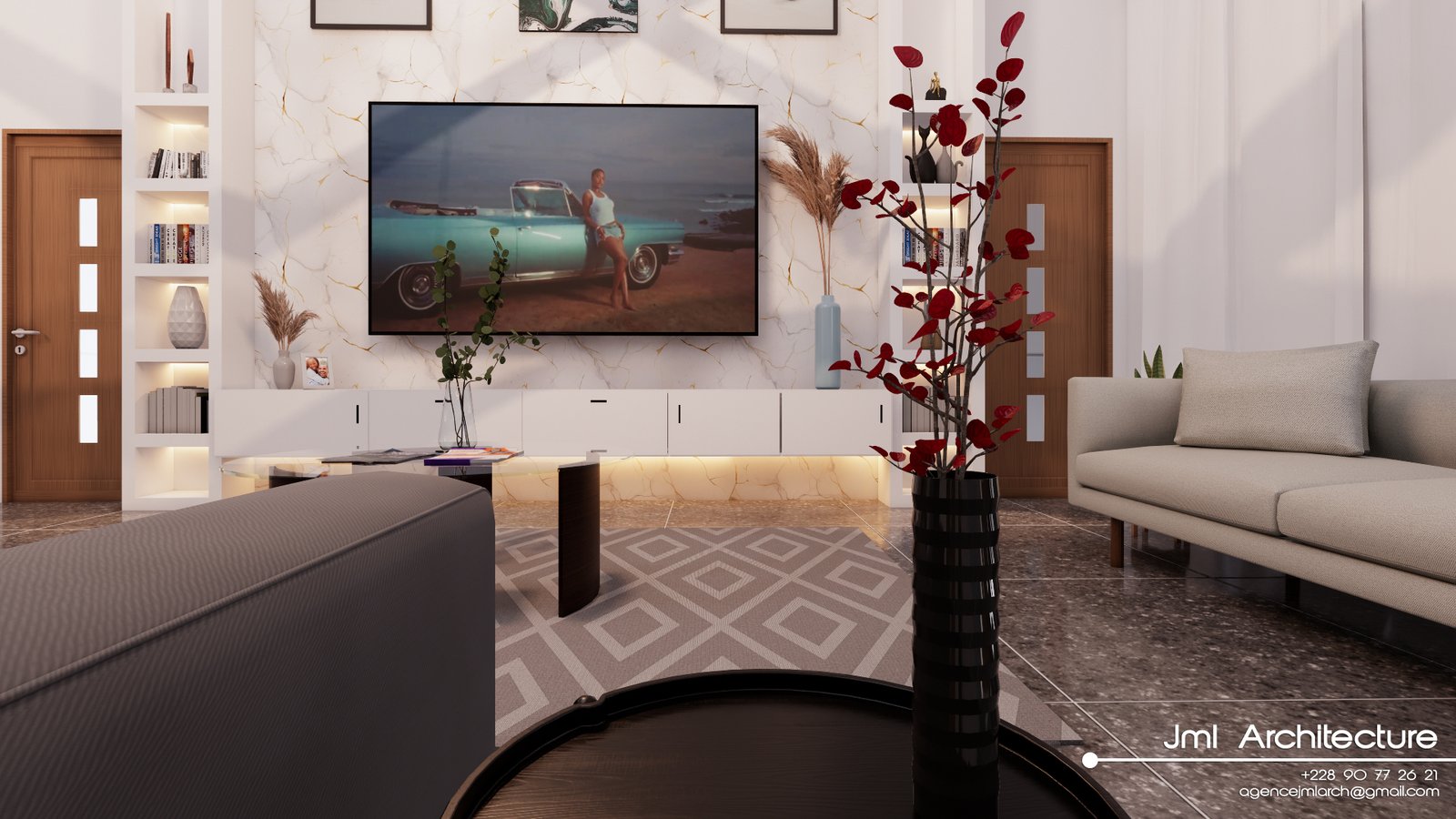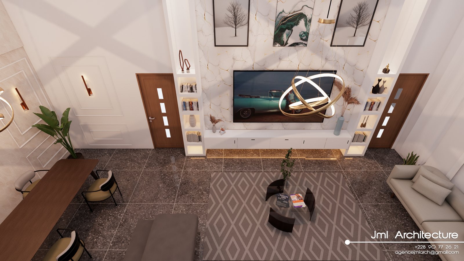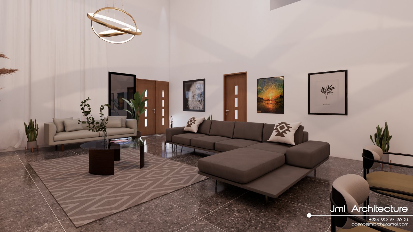 Espace vaste et lumineux avec plafond très haut, murs blancs et mur d’accent marbré au veinage doré. Mobilier design alliant canapé sombre, fauteuil beige et table basse en verre et bois, sublimé par un luminaire sculptural et des étagères rétroéclairées. Un intérieur sophistiqué, alliant luxe, modernité et confort chaleureux.