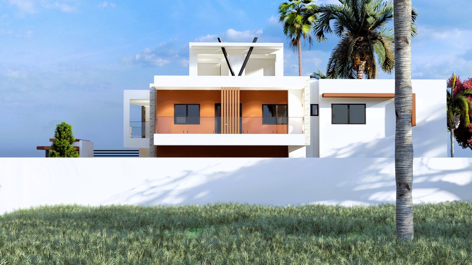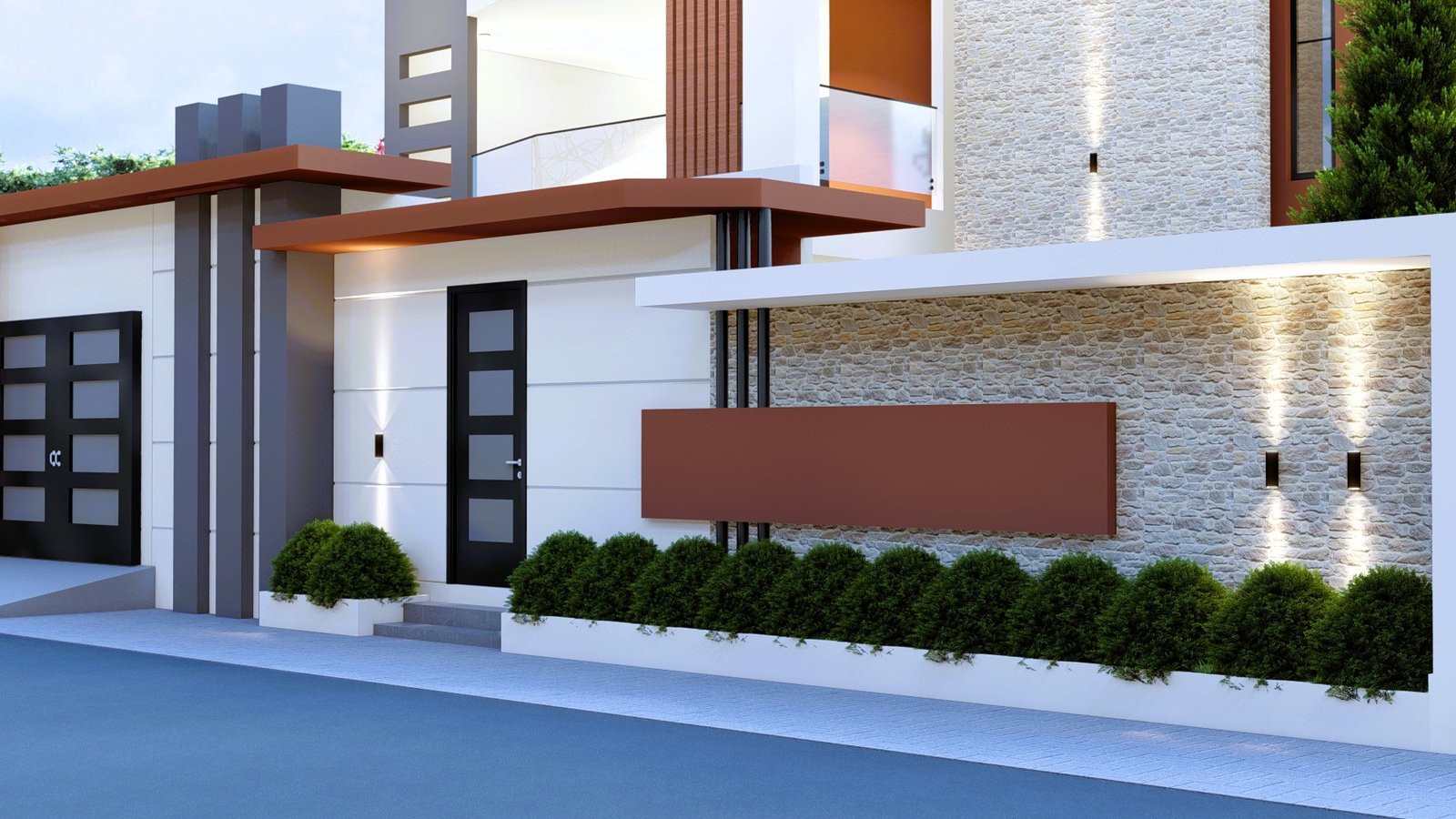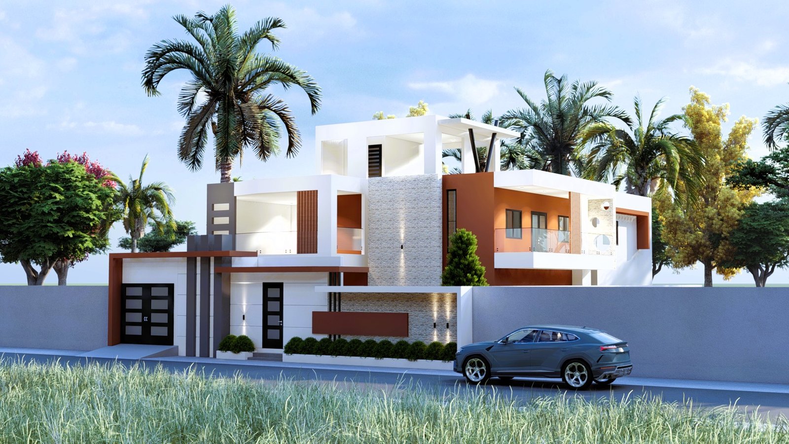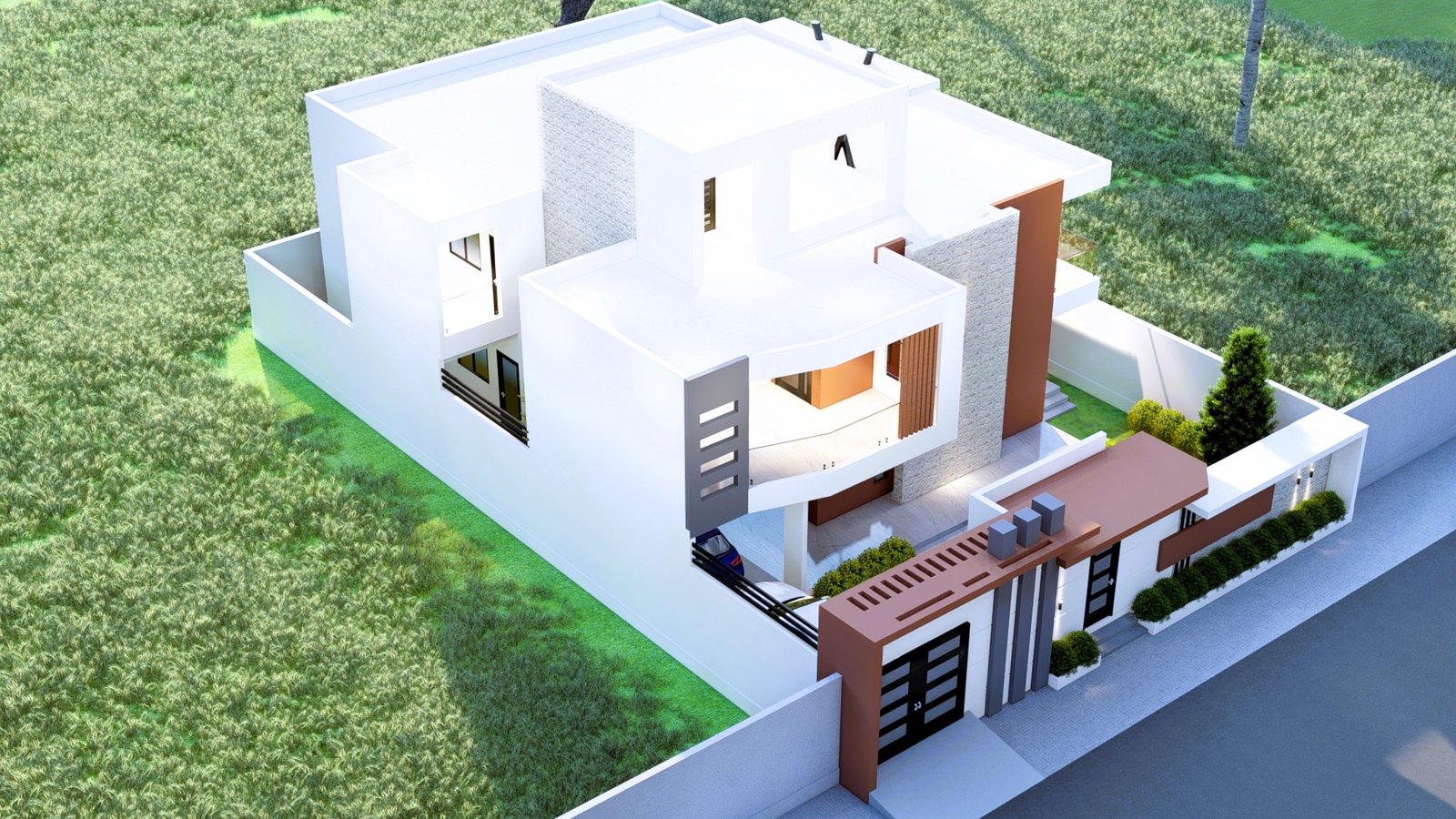 Maison moderne à deux niveaux au design contemporain, avec façade élégante mêlant blanc, gris et brun. De larges ouvertures vitrées, des terrasses lumineuses, un jardin soigné et un parking couvert offrent un cadre de vie confortable, moderne et haut de gamme, au cœur d’un environnement calme et verdoyant.