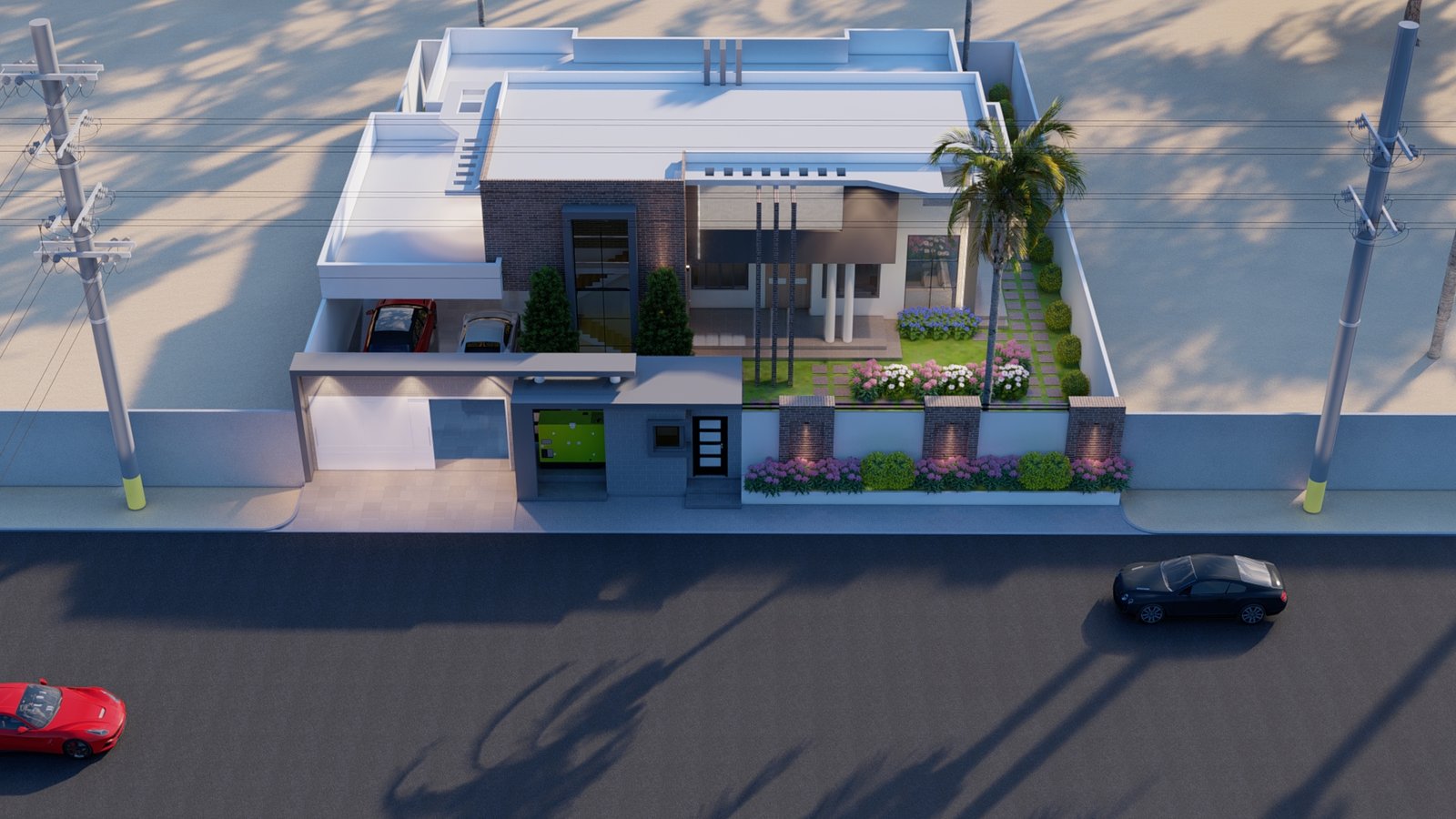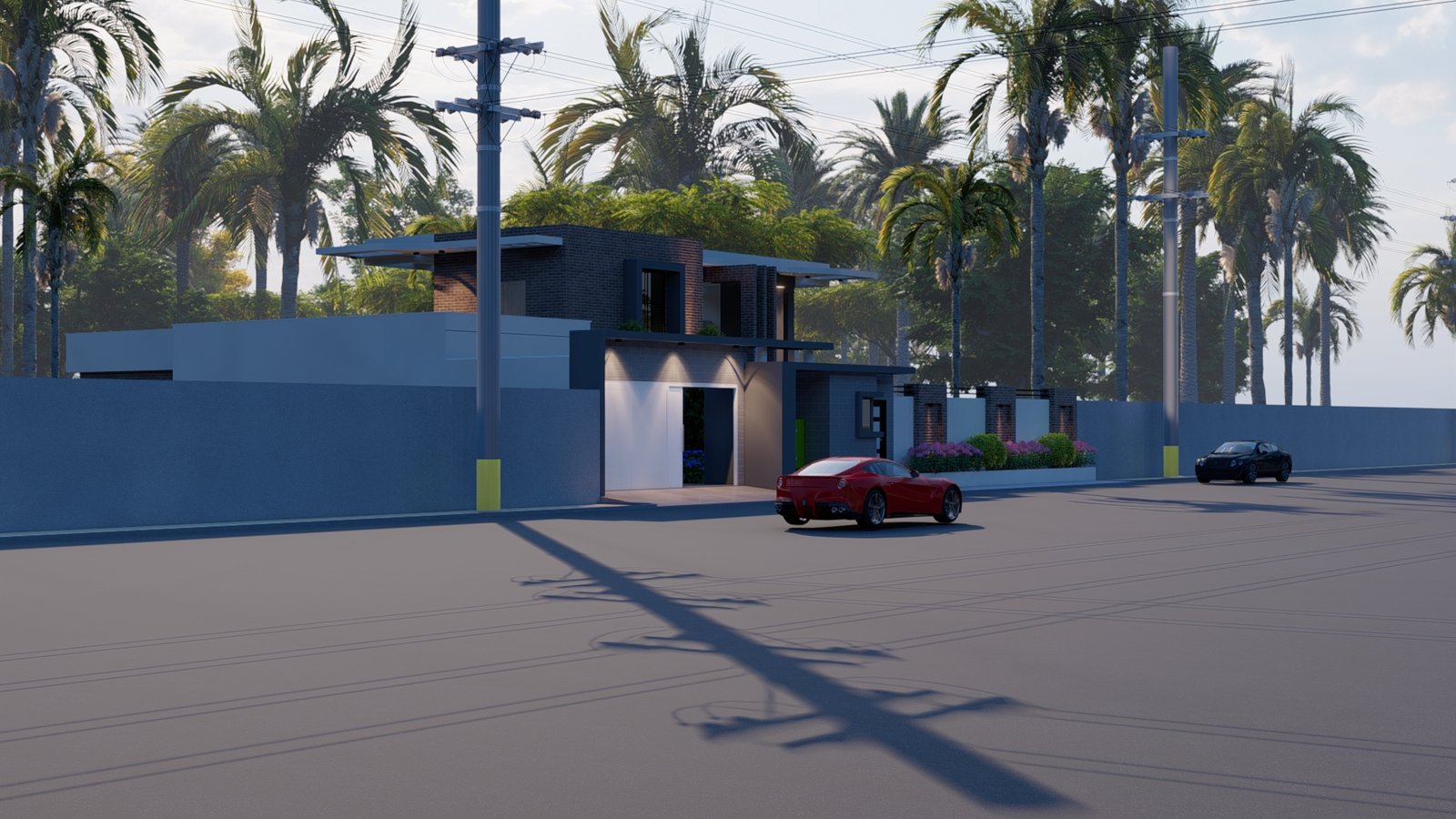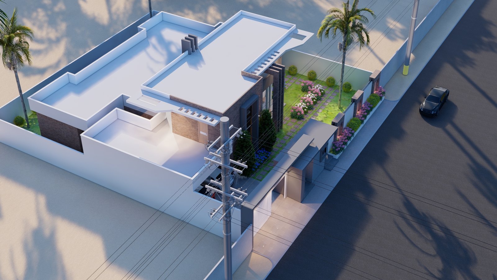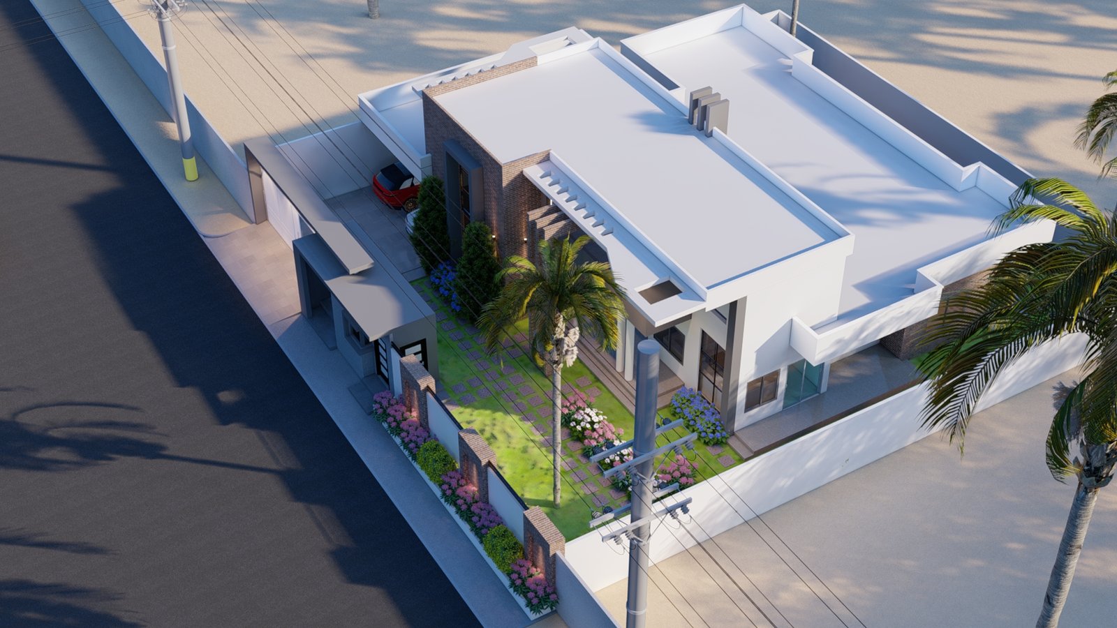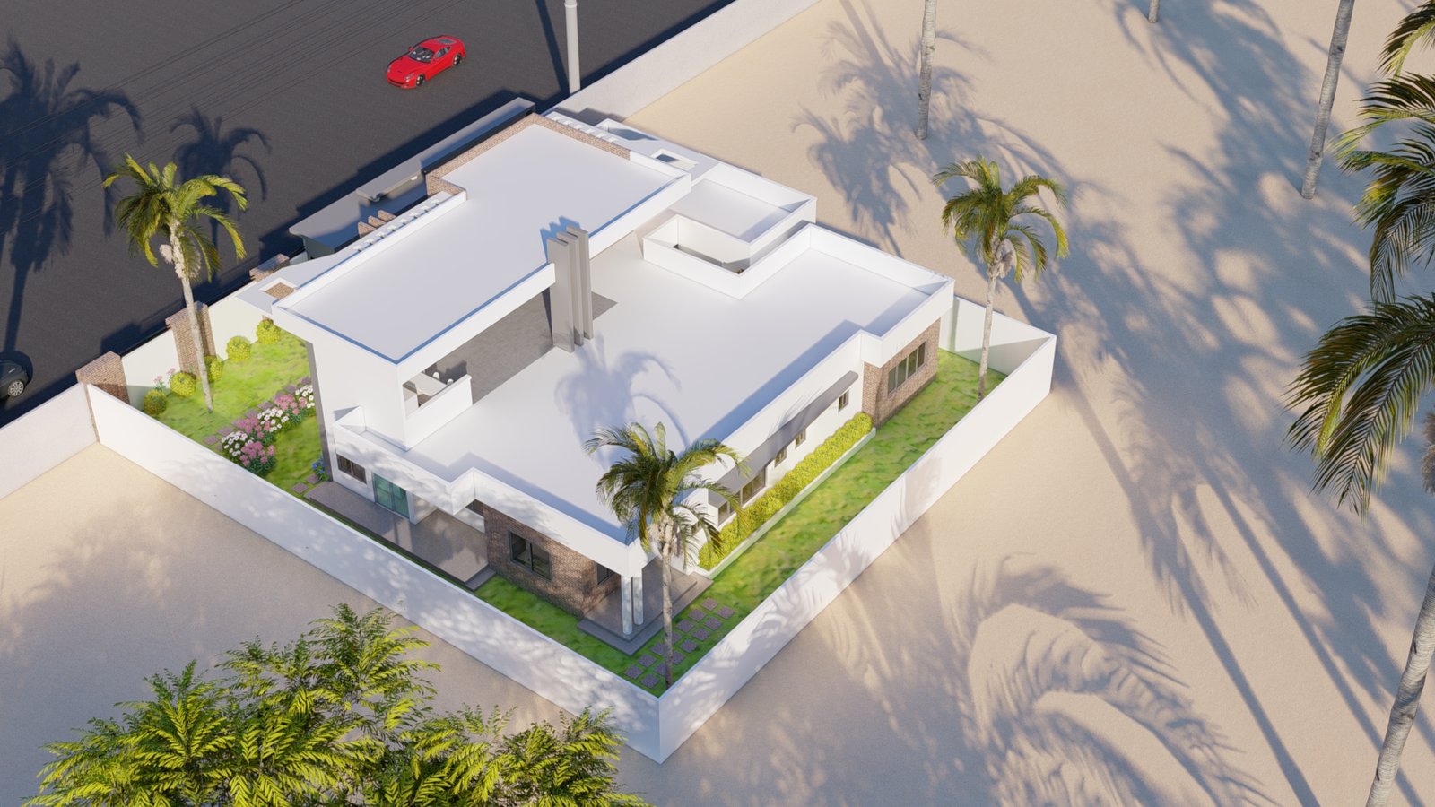 Maison moderne aux lignes nettes, toit plat et façade mêlant murs blancs, briques apparentes et éléments gris foncé. Son jardin soigneusement aménagé avec pelouse, palmiers et massifs fleuris offre une atmosphère élégante et tropicale. Entourée d’un mur blanc avec portail moderne, elle allie confort, lumière naturelle et design contemporain.