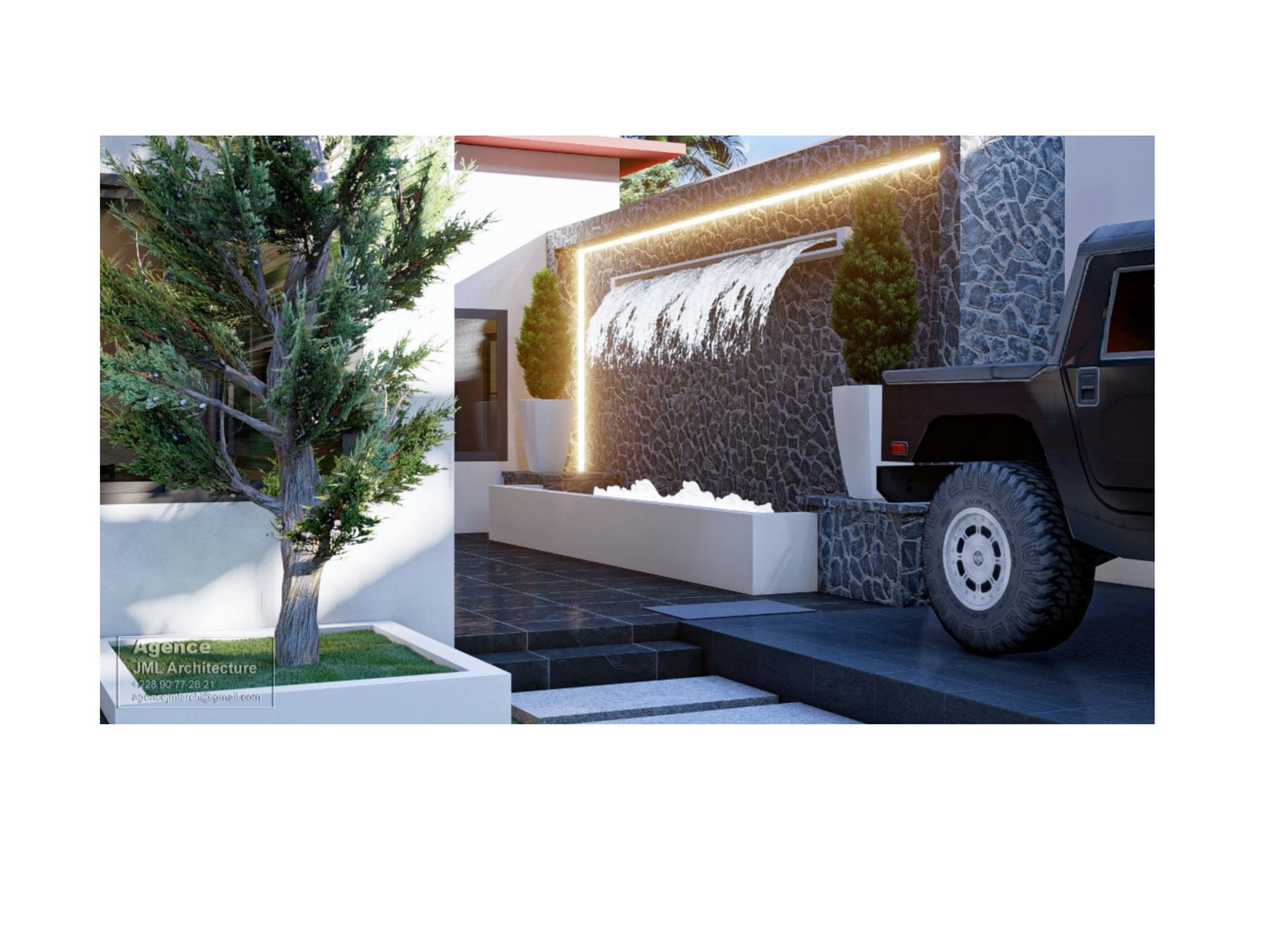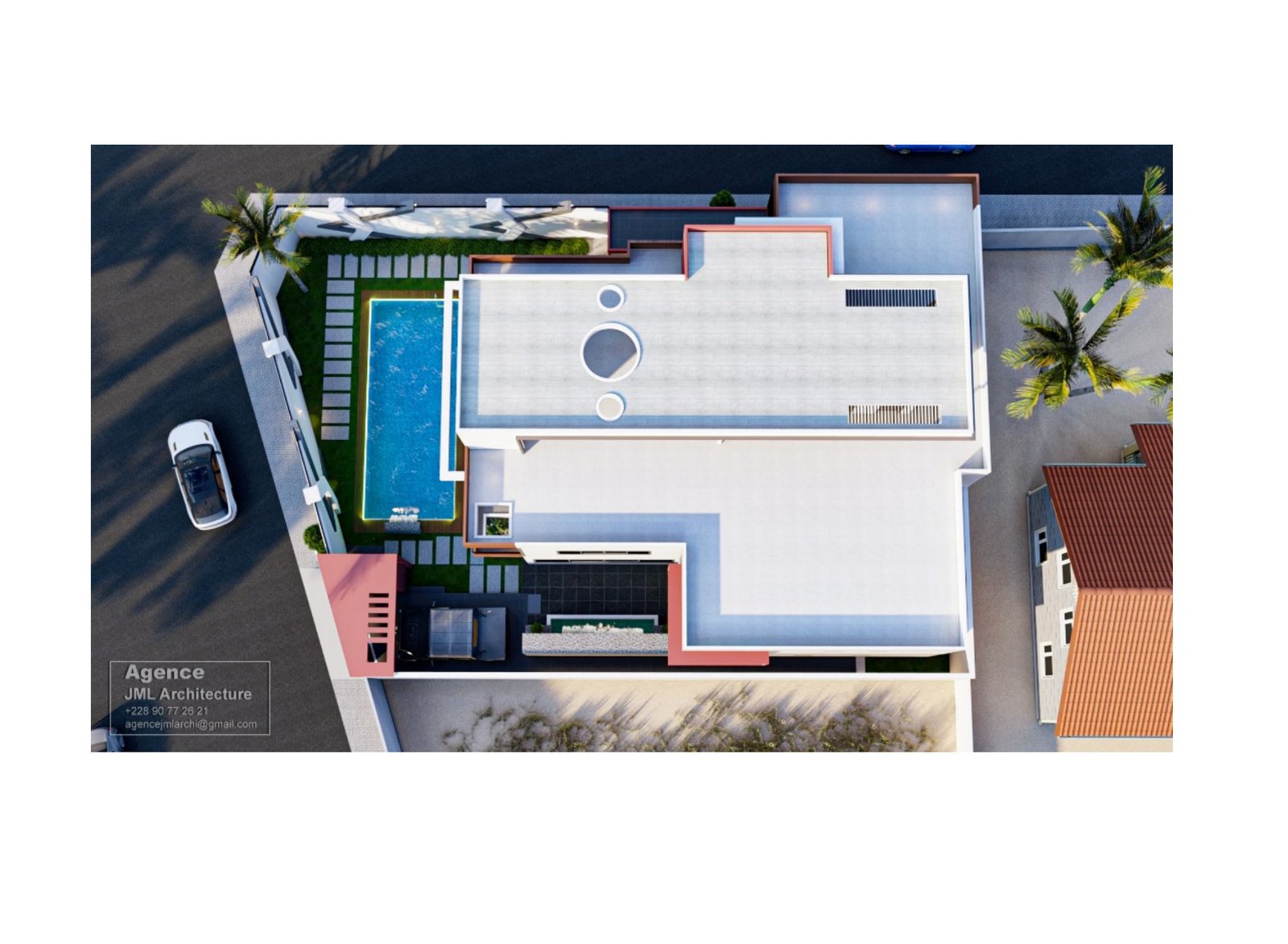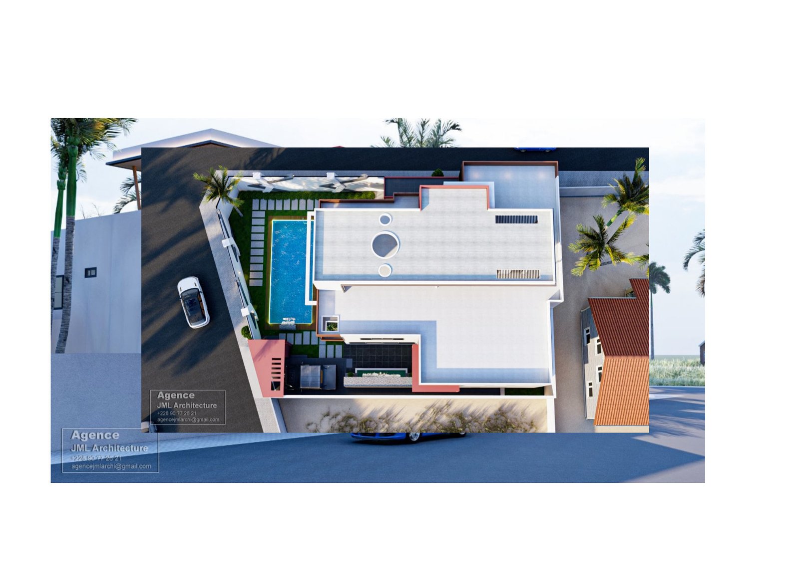 Vue aérienne d’une maison moderne à deux niveaux, mêlant formes cubiques, matériaux contrastés (blanc, bois, brique) et larges baies vitrées. Dotée d’une terrasse ouverte, d’une piscine et d’un jardin tropical, elle offre un cadre élégant et lumineux, signé Agence JML Architecture.