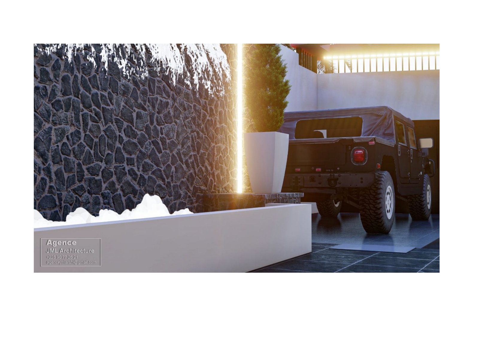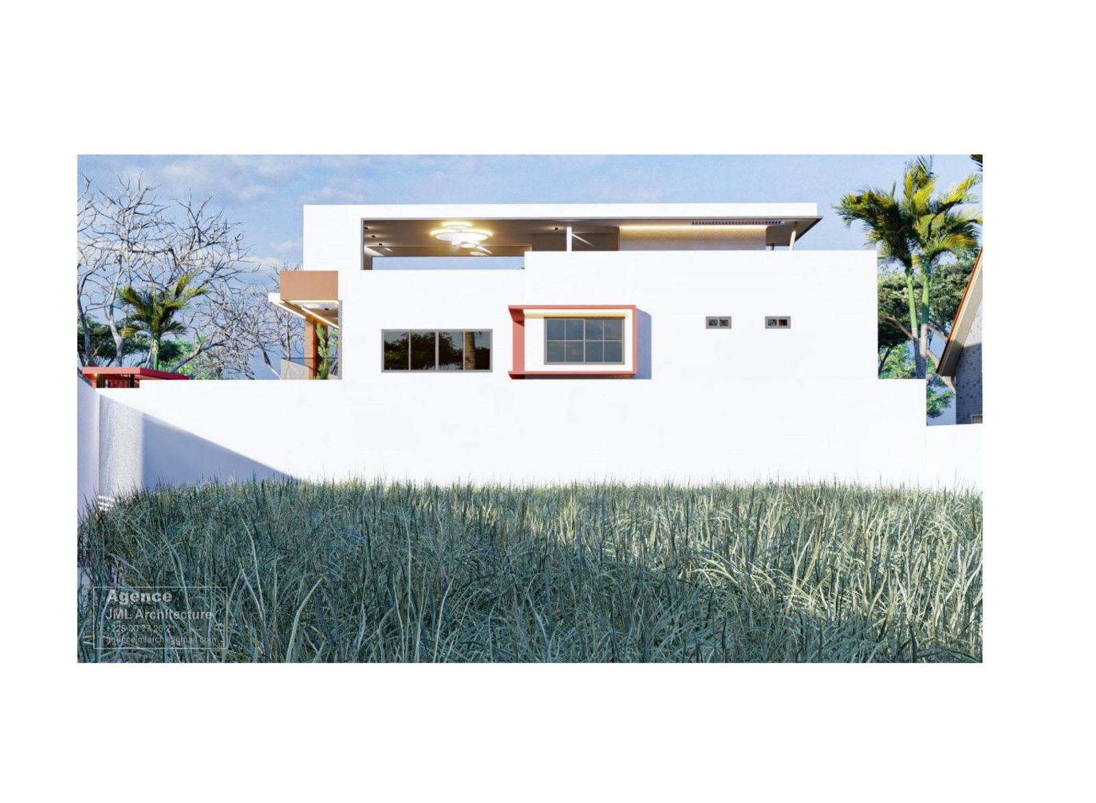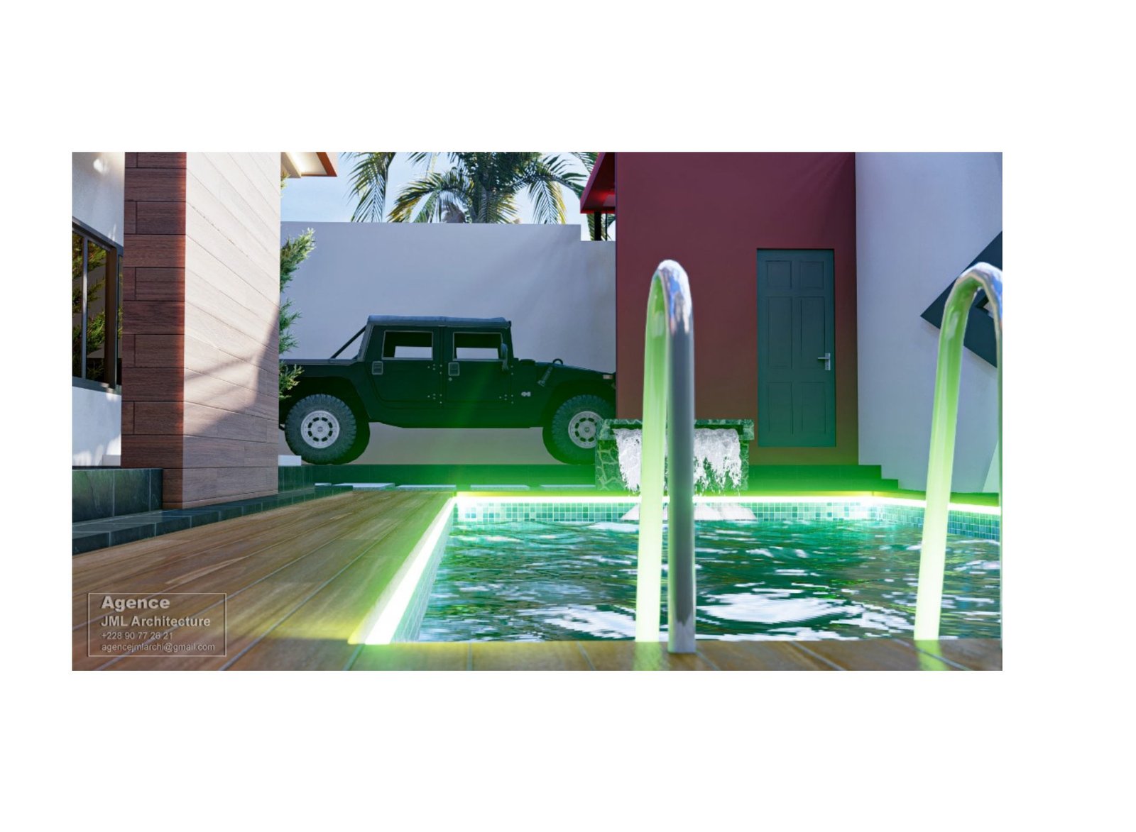 Vue aérienne d’une maison moderne à deux niveaux, mêlant formes cubiques, matériaux contrastés (blanc, bois, brique) et larges baies vitrées. Dotée d’une terrasse ouverte, d’une piscine et d’un jardin tropical, elle offre un cadre élégant et lumineux, signé Agence JML Architecture.