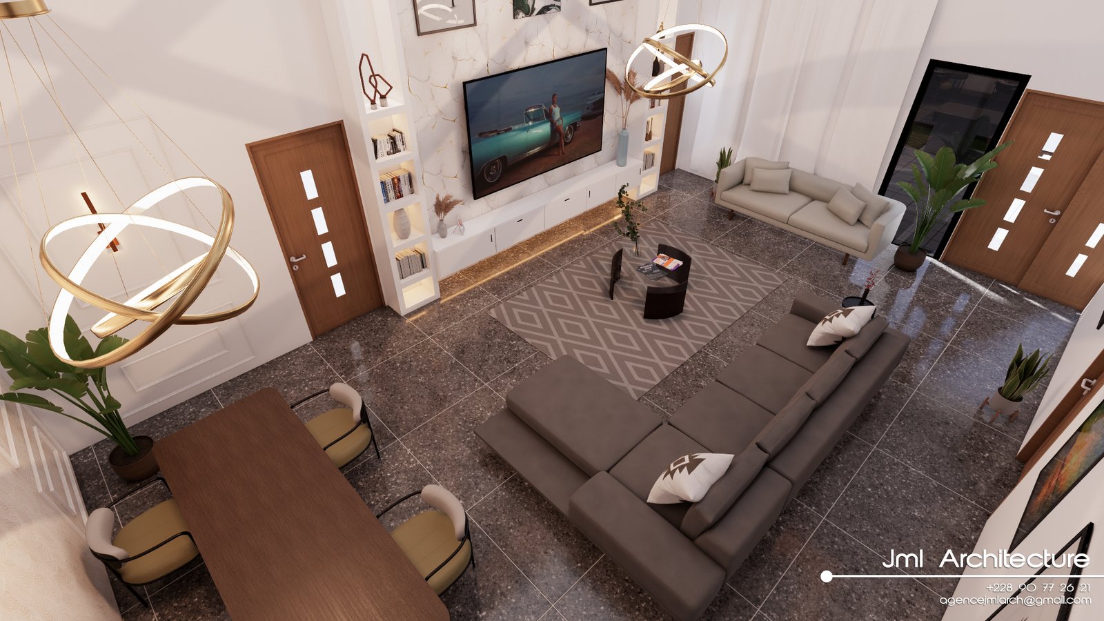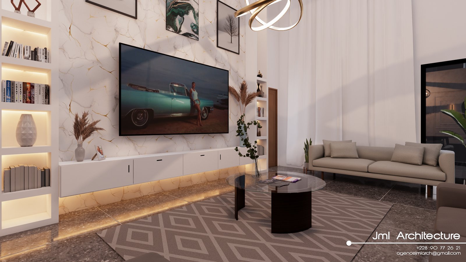 Espace vaste et lumineux avec plafond très haut, murs blancs et mur d’accent marbré au veinage doré. Mobilier design alliant canapé sombre, fauteuil beige et table basse en verre et bois, sublimé par un luminaire sculptural et des étagères rétroéclairées. Un intérieur sophistiqué, alliant luxe, modernité et confort chaleureux.